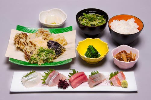 新鮮なお刺身と野菜の天ぷらがセットになった。お得なランチです。
